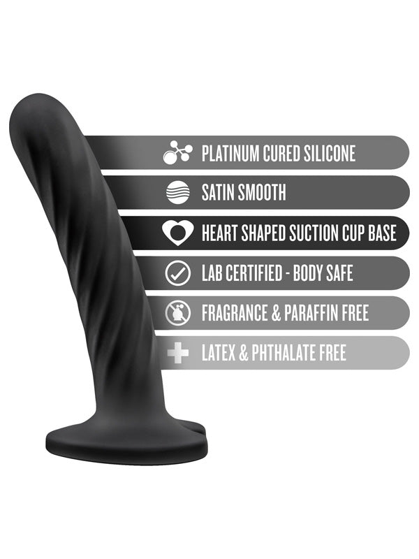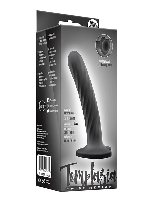 The Blush Temptasia Twist Medium silicone dildo features a slim profile and swirling texture. The heart-shaped base includes a strong suction cup and is harness-compatible. The Temptasia Twist is a fun addition to your playtime, solo or with your partner. Its medium size makes it an excellent choice for a new dildo user, or for anyone who enjoys shorter, slimmer toys. Made of 100% platinum-cured body-safe silicone the toy is easy to clean with gentle soap and water.