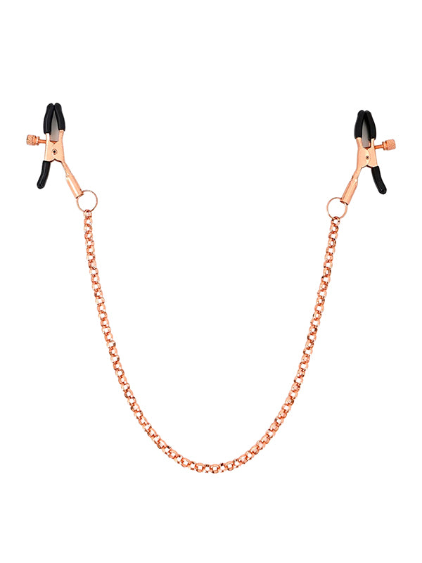 - Rose gold nipple clamps with rubber tips, adjustable pressure screw and chain connector (full length: 48 cm)