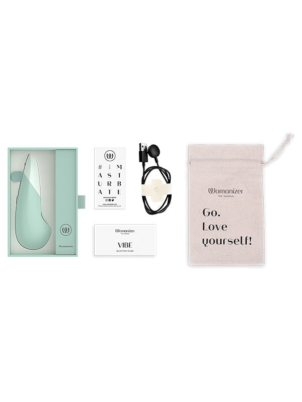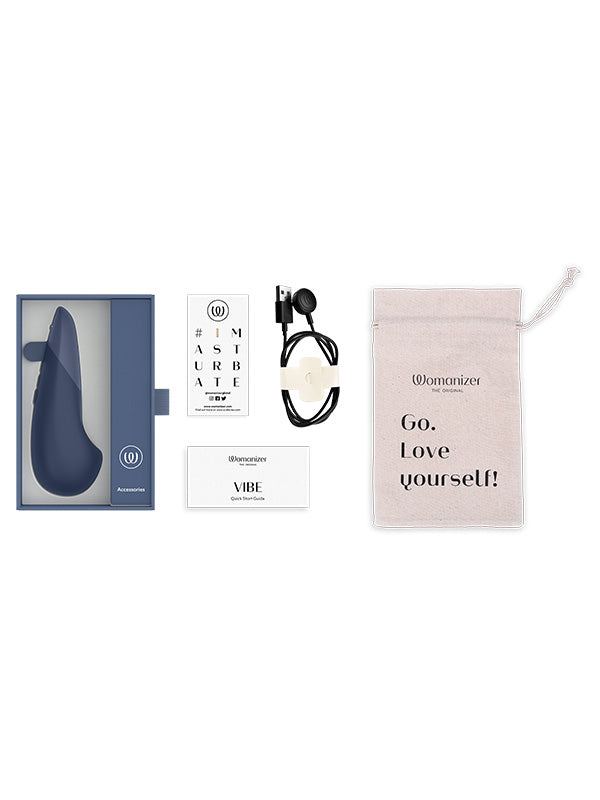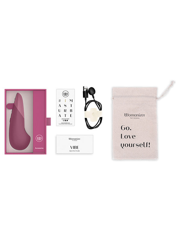- Includes: Womanizer Vibe, Cotton storage pouch, Additional stimulation head, Quick start guide, Compliance & Safety Information, #Imasturbate sticker, USB cable with magnetic charging pins (AC adapter not included)